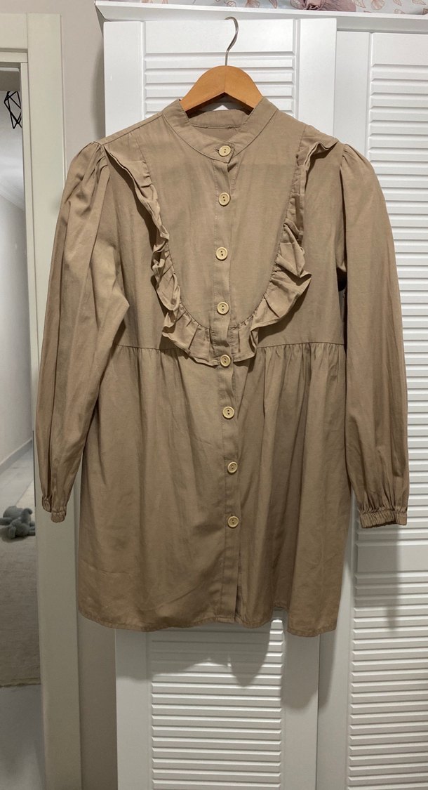 Yumuşak keten kumaştan, uzun kollu, bej renkli, bol kesim ve yakalı Fırfır detaylarıyla bohem tarzda, günlük kullanıma uygun.