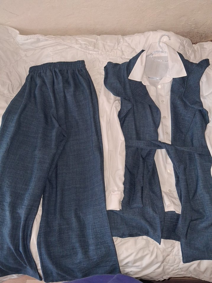 Mavi-beyaz renkte, yumuşak keten kumaştan yapılmış, kollu ve drapeli tasarıma sahip. Normal kesim ve midi boyda, ofis kullanımı için uygundur. Tesettüre uygundur