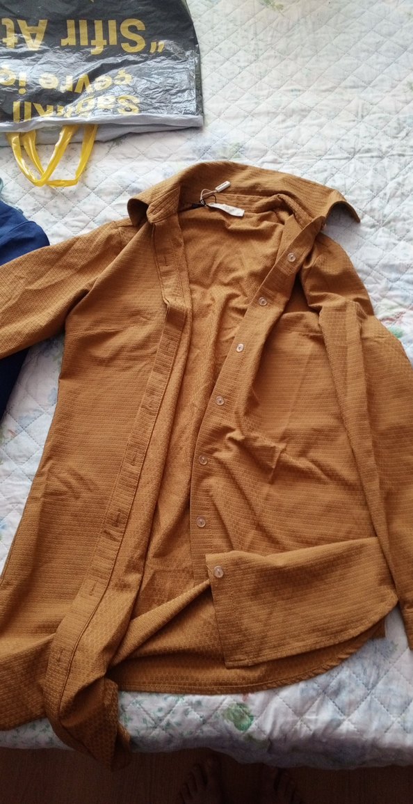 Düğmeli, bol kesim kısa boy bej gömlek tunikbparlak sentetik kumaştan üretilmiştir. Günlük sokak stili için uygundur. Marka etiketi 'aZe' yazılıdır.