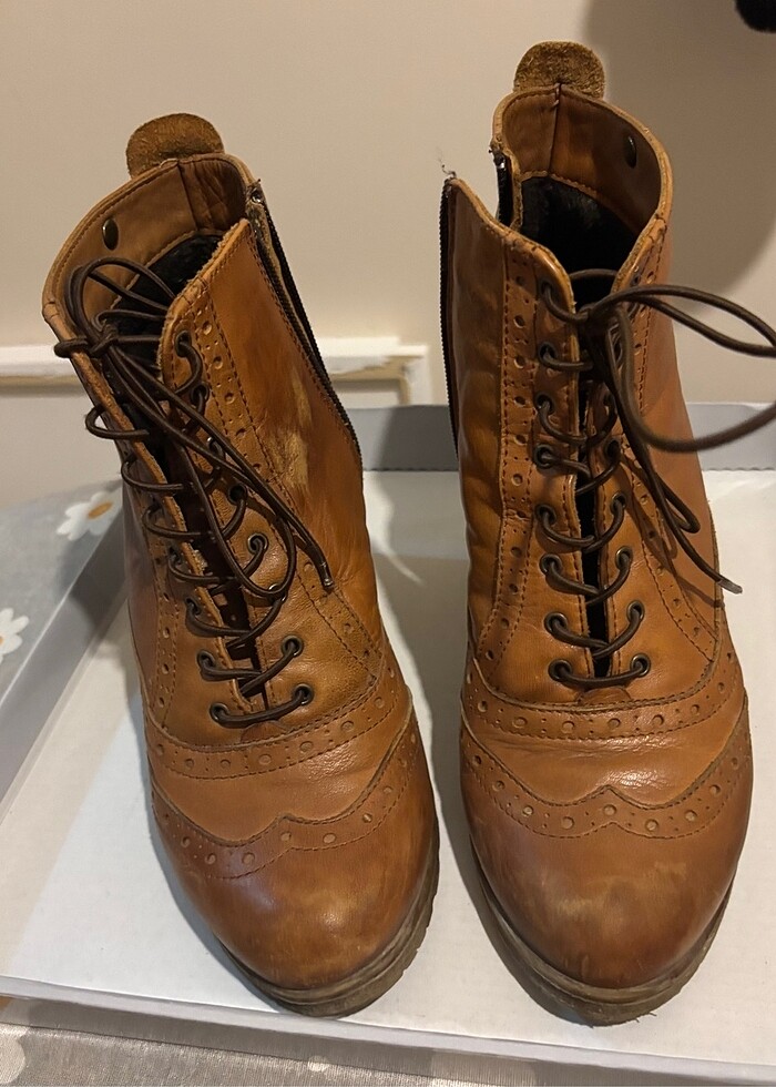 Gön marka hakiki deri taba rengi bot, giyimi çok rahat, sağ ayakta renk açılma olmuş, arkada küçük çizkler var resimde görünüyor içi güzel az giyildi