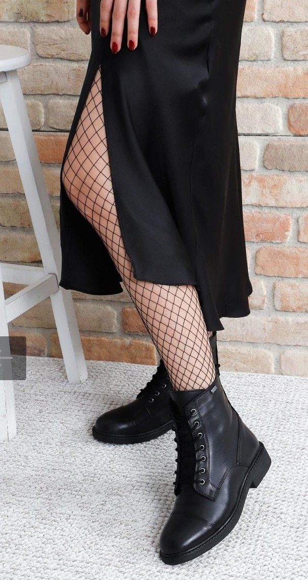 Siyah deri, kare desenli, blok topuklu ve bağcıklı gotik tarzda günlük kullanıma uygun botlar. hiç bir kuduru yok faturası kutusu duruyor