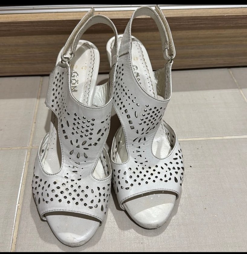Nakış detaylı, cırtlı, beyaz topuklu kadın sandaleti. Hakiki deri, günlük kullanım için uygun.Her şeyin altına uyar. 40 numara ama rahat kalıp 41 numaraya da uyumludur.