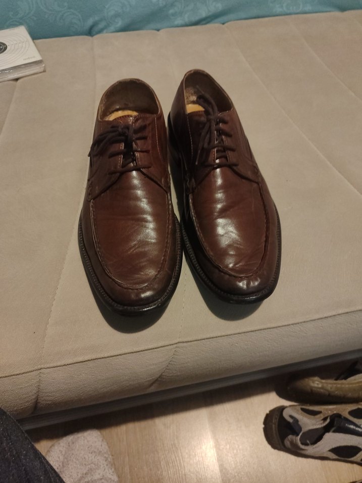 Koyu kahverengi deri erkek ayakkabılar, klasik ve tokalı tasarıma sahip olup ofis kullanımı için uygundur. Yüzeyi desensiz ve düzgündür.