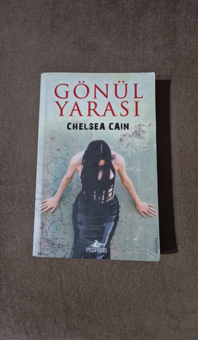 Chelsea Cain'in "Gönül Yarası" adlı romanı, çatlak bir duvar önünde siyah elbiseli bir kadını gösteren kapağıyla Pegasus tarafından yayımlanmıştır. Başka bir uygulamadan ikinci el olarak aldım. Dijital baskı bandrolü yok. Onun dışında okumaya engel bir durumu yok. Fiyat uygun tutulmuştur