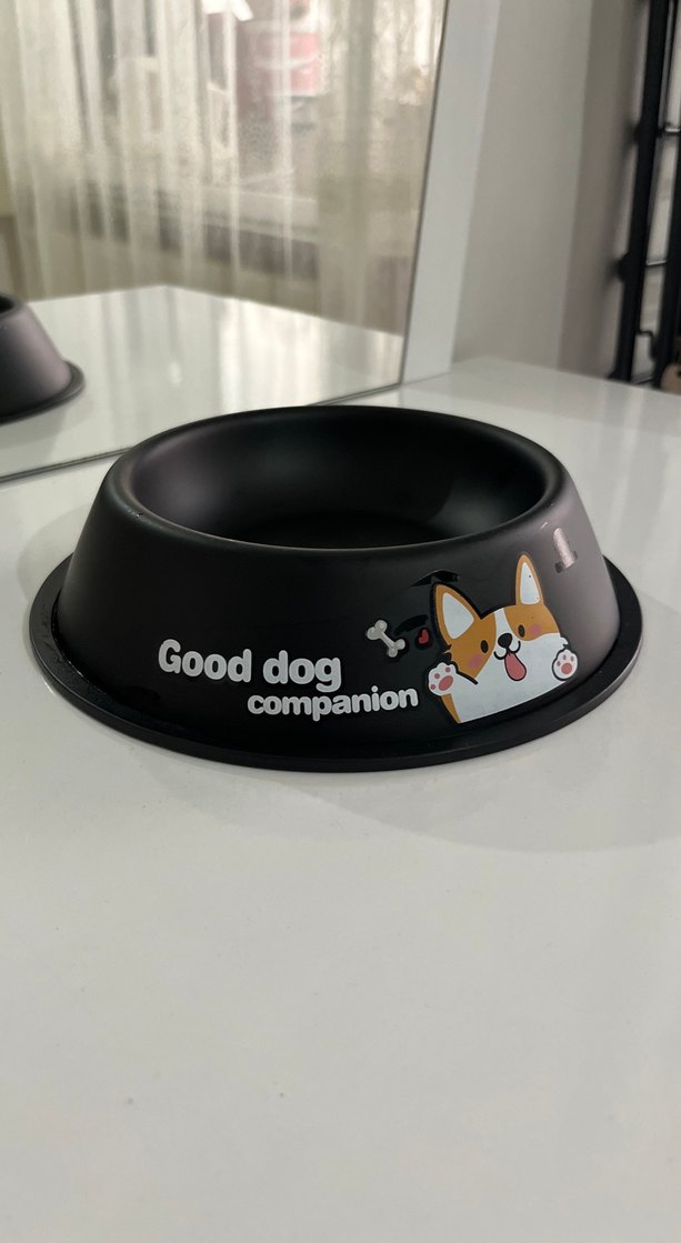 Good Dog Companion yazılı siyah köpek mama kabı, sevimli köpek figürü ile dikkat çeker.çelik