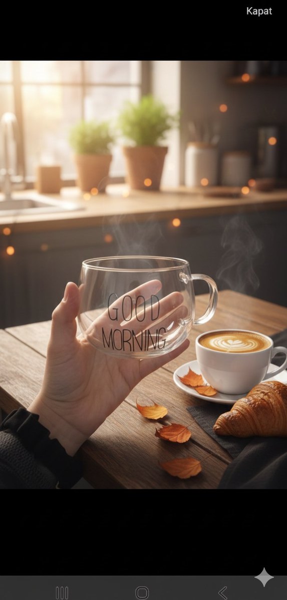 "Good Morning" yazılı, kulplu şeffaf cam kupa. Sıcak içecekler için uygun, sade tasarımlı bir bardak ☕.