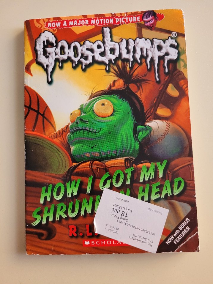 R.L. Stine imzalı "Goosebumps: Başım Nasıl Küçüldü" kitabı, spor topları arasında yeşil bir küçülmüş kafa resmiyle korku dolu bir hikaye sunuyor. Bonus içerikler ve büyük bir filmle bağlantılıdır. Kitabın arka kapağının yüzeyi yırtıktır , ön tarafta ise ekiket yapışıktır. Okuma kalitrsini hiç etkilemez.