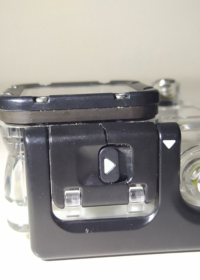 GoPro Hero 3 Housing, Su geçirmez kap. Fotoğrafta göründüğü gibi üst plastik kısmında küçük bir çatlak vardır. Kapanmasında açılmasında hiçbir sorun teşkil etmemektedir. Bu şekilde kullanılmaktadır. Dilerseniz yapıştırarak tamir ederek te kullanabilirsiniz.