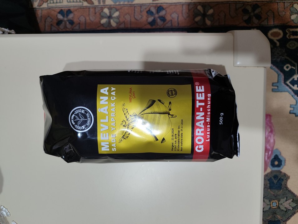Gorant-Tee Mevlâna sade yaprak çay, 500g paket içinde 600S koduyla. Koyu sarı toz formunda, çay yapımı için uygundur.