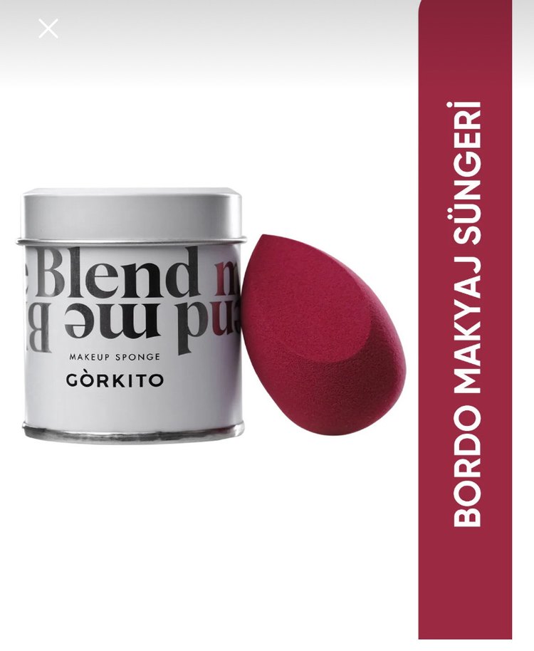 Bordo renkte, pürüzsüz karıştırma için yumuşak dokulu Görkito makyaj süngeri. Metal saklama kutusunda. Hiç kullanılmadı
