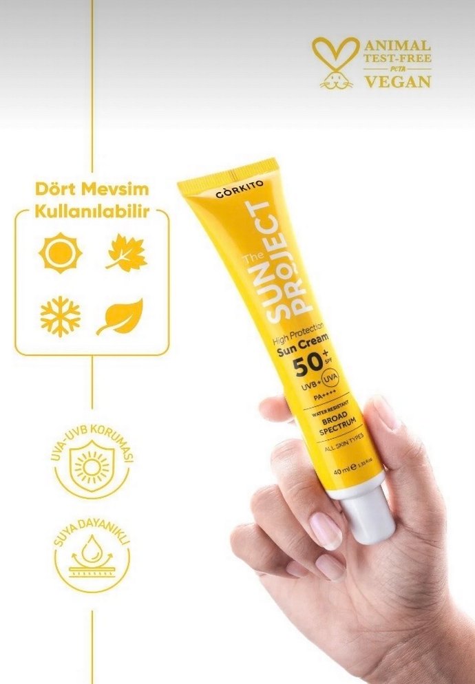 Gorkito vegan güneş kremi, SPF 50 ve geniş spektrum UVA-UVB koruması sağlar. Suya dayanıklı ve dört mevsim kullanılabilir. 40ml