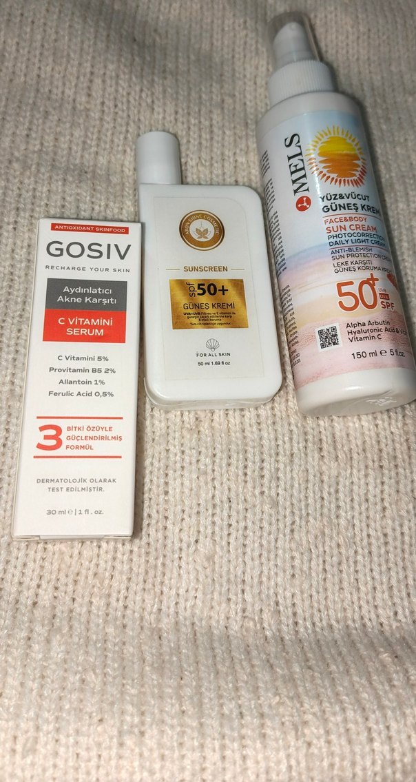 GOSIV C vitamini serumu, %5 C vitamini, %25 provitamin B5, %1 allantoin ve %0,5 ferulik asit içerir. İki adet SPF 50+ güneş kremi yüz ve vücut kullanımına uygundur. ürünler sıfırdır aldığınız gün kargolanır. son fiyattır. içerigi 50 Spf 50 milim güneş kremi 50 spf 150 vücut güneş kremi c vitamini serum akne karşıtı. yorum yapma sözü verecekseniz eğer yanında ağda hediyesi ile.