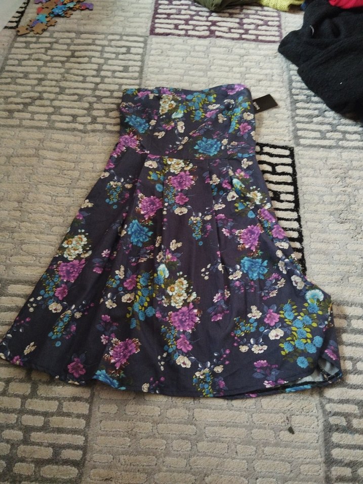 Sentetik kumaştan, koyu renkli çiçek desenli, pileli ve bol kesim uzun straplez elbise. Romantik akşamlar için bohem tarzda.