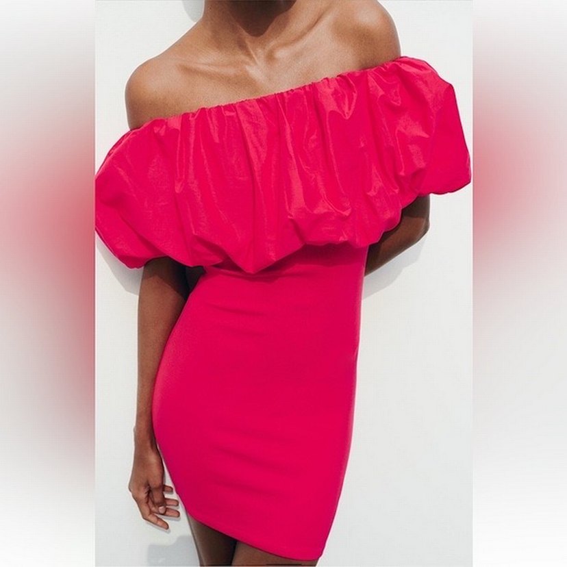 pembe sentetik kumaştan, omuzları açık, volan detaylı, vücuda oturan mini elbisedir. Parti için uygundur. 1 kere kullandı