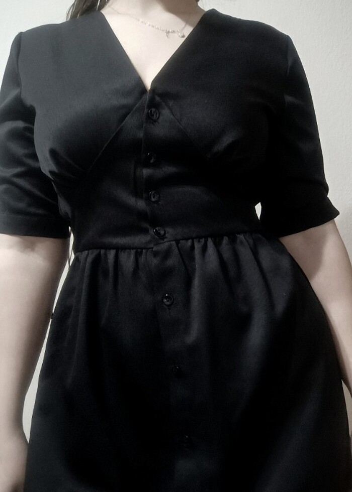 Çok tatlı bir elbisedir. Boyum 160 dizlerimden birkaç parmak üzerinde bitiyor. Herhangi bir defosu yok.