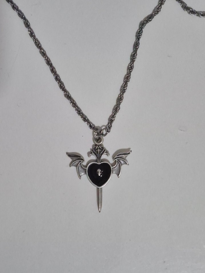 Bu siyah gotik kolye, detaylı zincir ve kanatlı, sivri uçlu kalp şeklinde bir kolye ucu içerir, rock punk havası ve romantik geceler için uygundur.