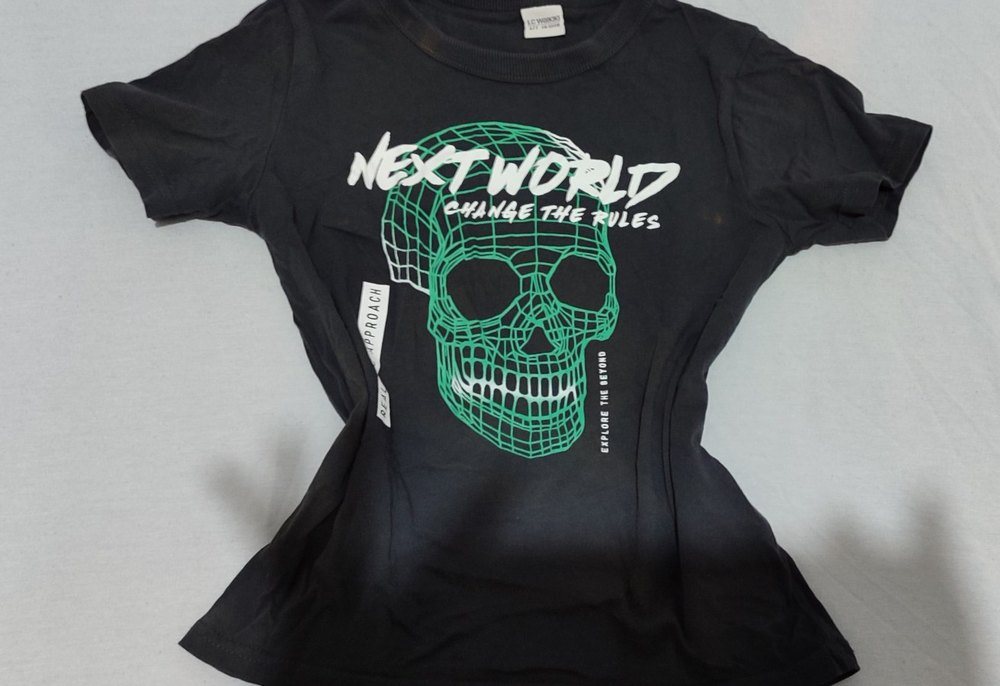 6-7 yaş erkek tişörtü ama kadınlar da bluz niyetine giyebilir. Yuvarlak yaka, yeşil kafatası baskısı ve 'Change the Rules' yazısı bulunur.fajat bazı yerlerinde çok hafif çamaşır suyu lekesi var.Rengi koyu gri