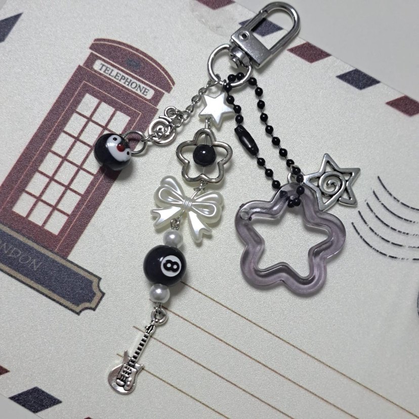 Mor yıldız ve siyah boncuklu süslemelerle zincir detaylı gotik tarzda anahtarlık. Küçük gitar ve fiyonk figürlü aksesuarlar içerir.
