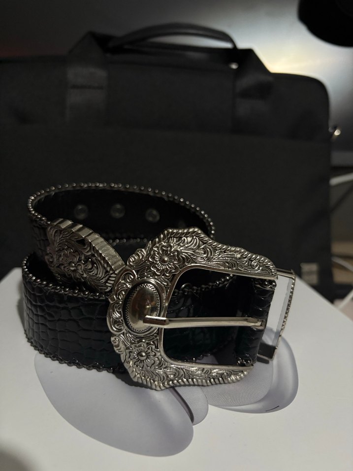Siyah deri kadına özel kemer, detaylı gümüş tokası ve vintage biker tarzıyla dikkat çeker.
