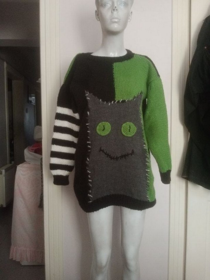 L/XL beden uyumlu, Gri, siyah, beyaz ve yeşil renklerde örgüden yapılmış, bol kesim, kedi desen, yuvarlak yaka, uzun kollu kadın kazak. Kalın ve kışlık tır. Yeni ördüm. Gothic grunge y2k Punk emo vampire witchy dark Coquette bohem hippi underground creppy alternative horror tarzlara uygundur. Kendi tasarım ve el emegimdir