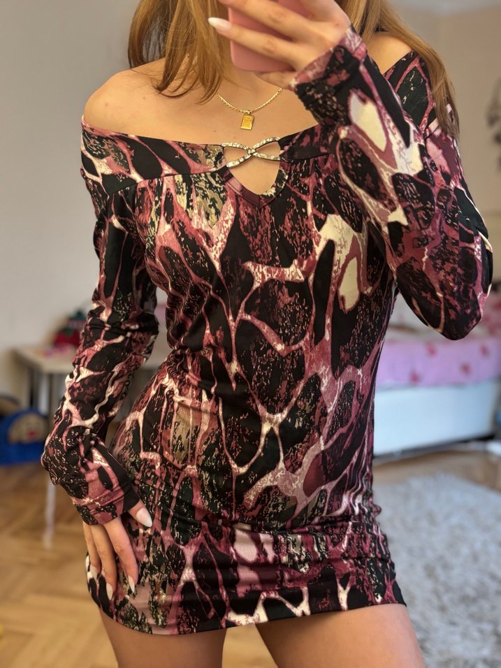 uzun kollu, zincir detaylı pembe yılan desenli dar kesim mini elbise, cesur ve göz alıcı tarz için uygun.