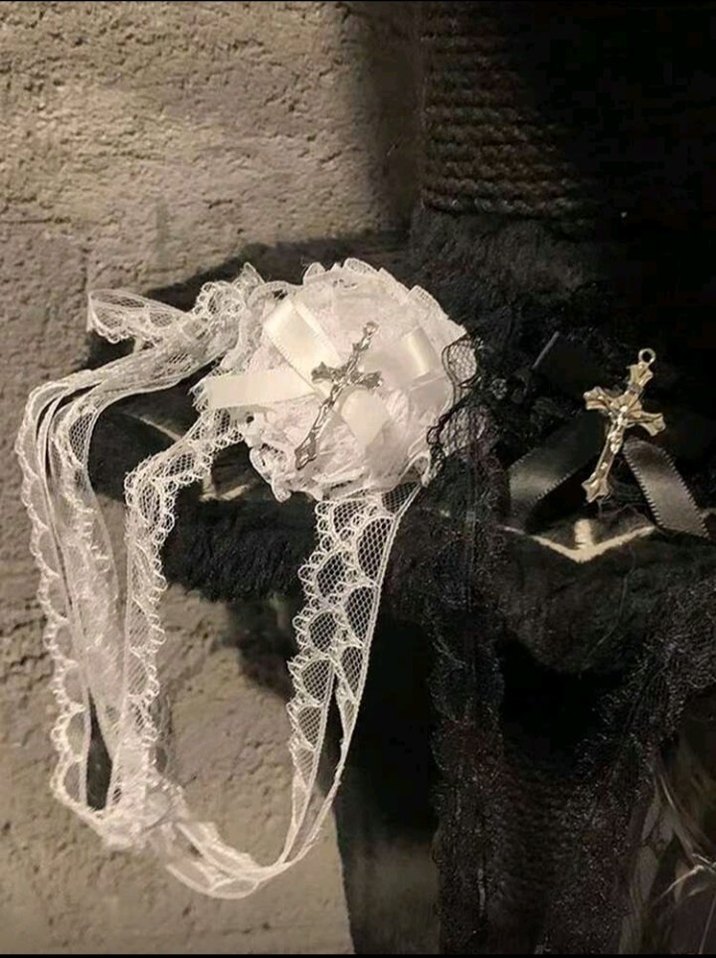 Sentetik kumaştan yapılmış, dantel ve haç detaylı beyaz gotik saç aksesuarı. Avant-garde ve trendsetter stiller için uygundur.