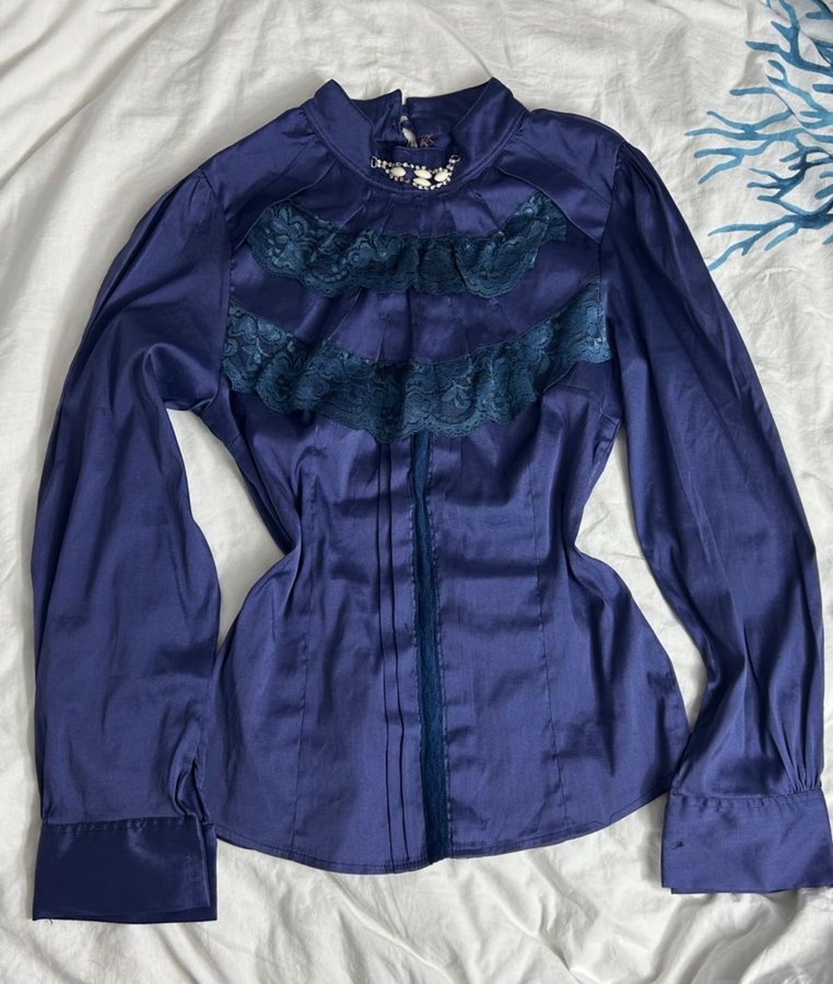 Lacivert, ipek gibi kumaştan, uzun kollu, düğmeli ve yakalı, gotik tarzda kadın gömleği. Ofis kullanımı için uygun, vücuda oturan kesime sahip.