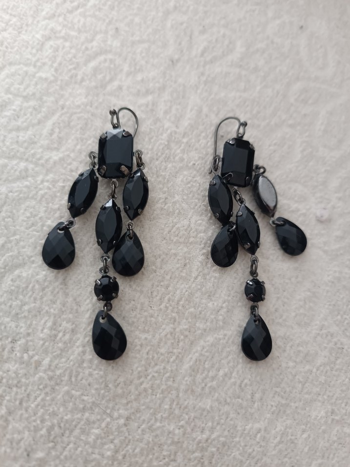 Gotik desenli, siyah boncuklu midi uzunlukta küpeler. Dış mekan için uygun, dikkat çekici tasarım.