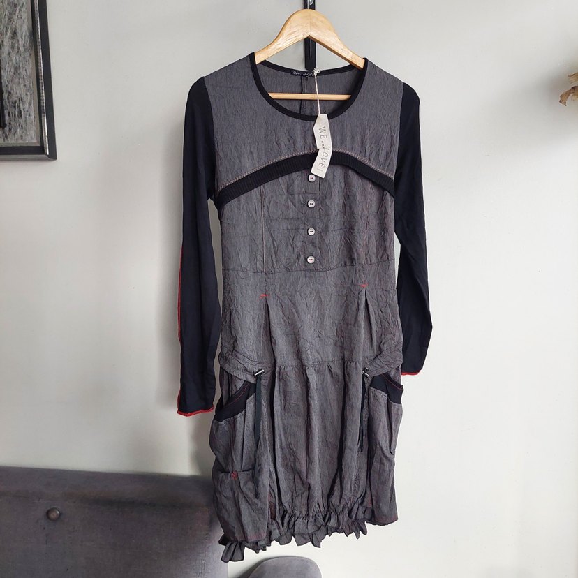 Gri keten kumaştan, uzun kollu, düğmeli ve cepli bol kesim uzun elbise. Parisli gotik ve avangart tarzları bir arada sunar. sıfir urun.