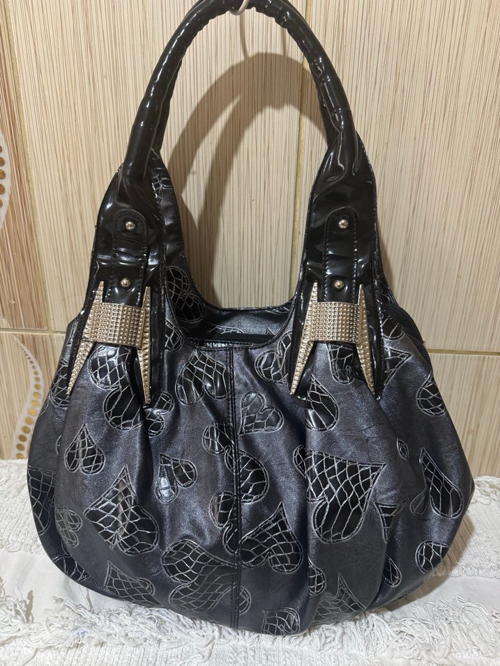 Siyah deri çanta, yılan desenli ve tokalı askılarla gotik tarzı ve trend günlük stili birleştirir. Siyah gri tonlarda, önde çok şık metal aksesuar, hafif parlak, üzerinde hafif kabarık kalpler var. Hobo modele yakın, üç ayrı bağımsız bölme. Yanlarda kemer büzme. Kulp, taban ve şeritler rugan diğer alanlar vinlekstir. Kulpun iç kısmında minimal çatlamalar var altta olduğu içn görünmüyor. 26 cm boy, 40 cm en, 16 cm taban. İade almıyorum detay sorun lütfen.