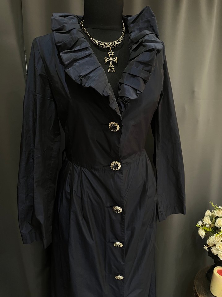 Satenimsi kumaştan yapılmış, uzun kollu ve düğmeli siyah uzun trençkot. Gothic tarz aşırı güzel bir yakası var L beden