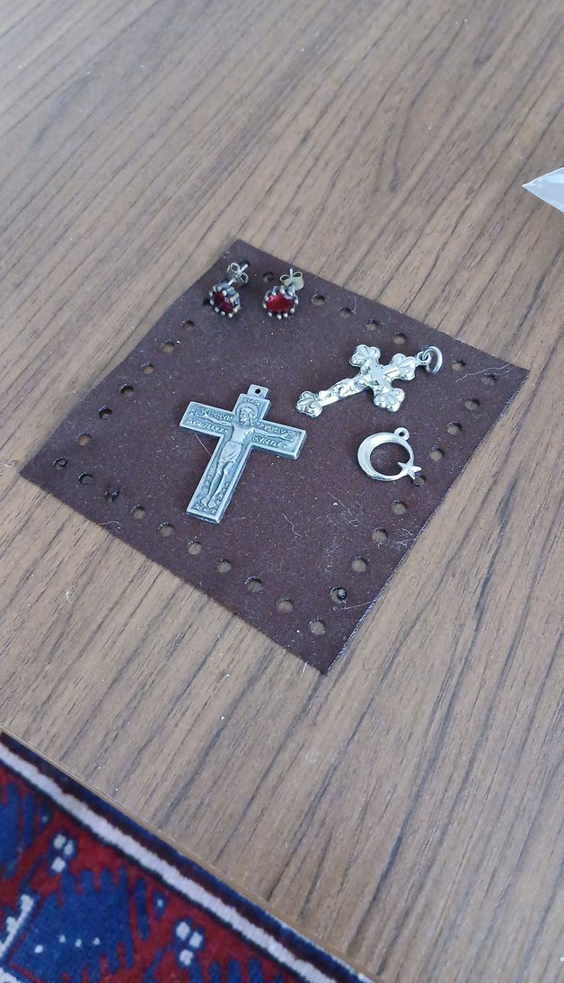 Koyu kahverengi gotik tarzda küpeleri ve kolye uçları seti. Metal malzemeden yapılmış haç ve hilal figürleri içerir.