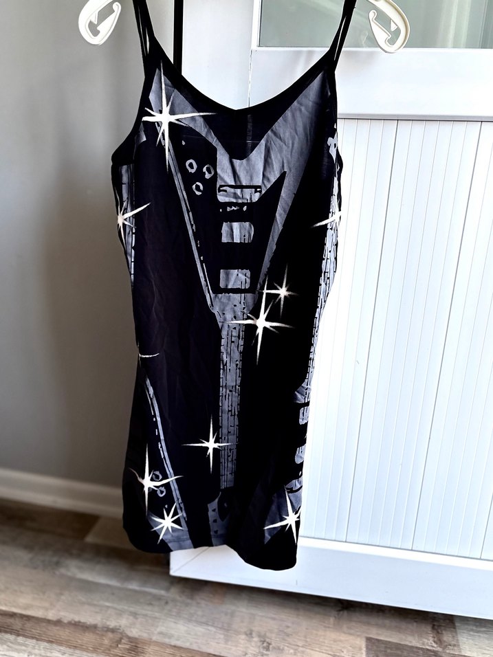 Xs ve s bedene uygundur Siyah renkte, V yaka ve baskılı desenli, drapeli detaylara sahip, midi boyda ve kolsuz kadın yeleği. Avant-garde parti tarzına uygun, dar kesim ve sentetik kumaş.