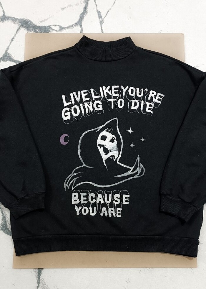 Üzerindeki tasarım baskı değildir, el yapımıdır. Kumaş boyası ile çizildi. Killstar'dan görüp yapmıştım 5 yıl önce. Baskısına ütü değdirmediğiniz sürece ve ters yıkadığınız zaman çıkması imkansız. Sweatshirt ince değildir, içini de çektim görmeniz için. Az kullanıldığı için eskimedi, deformesi yoktur. S ve M bedene uyacaktır. Ölçüleri; iki koltukaltı arası: 57 cm, uzunluk: 61 cm