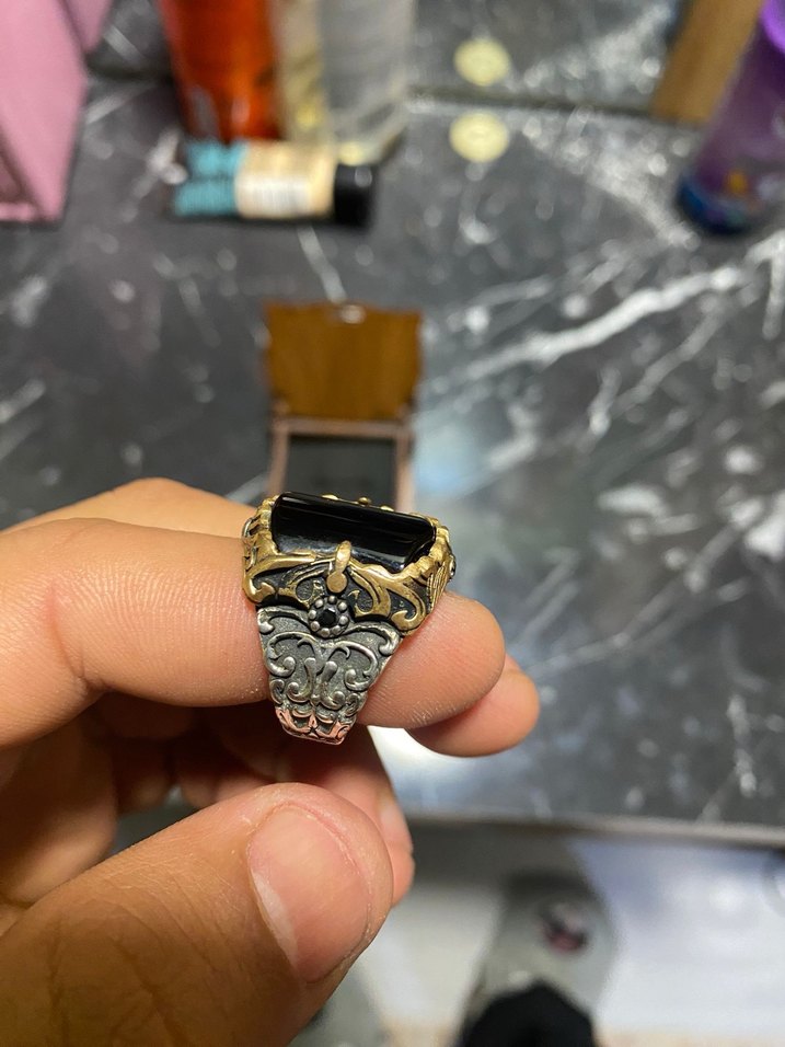 Bu erkek yüzük, siyah bir merkeze sahip altın renkli gotik tarzda olup, ahşap bir kutuda sunulmaktadır.