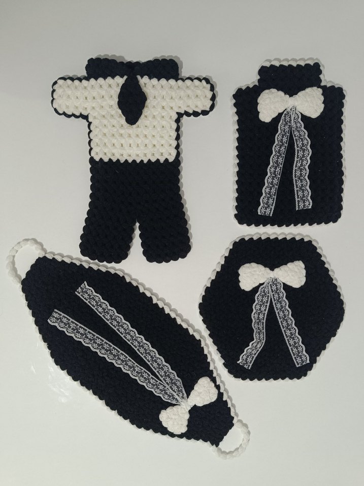 Sipariş verene fotoğraftakiler gönderilecektir Farklı modeller isterseniz modele ve miktarına göre fiyat değişiklik gösterebilir. Dantel detaylı fiyonk süslemeli, el yapımı siyah beyaz gotik tarzda dört parçalı set. Örgü dokulu tasarım içerir.
