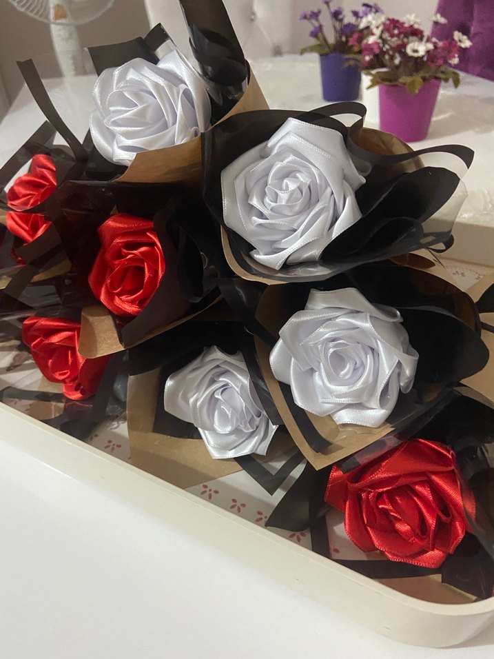 Kırmızı ve beyaz saten güller, siyah ve kahverengi kağıt ile gotik tarzda paketlenmiştir. Kişiye özel hazırlanır. Tane fiyatıdır buket için ayrı fiyat alınız.