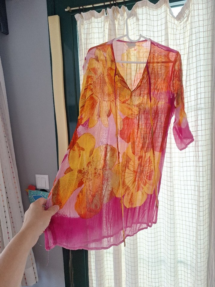 gottex marka pareo iplerinde sökülme olmustur baska sorun yoktur askıda asılı iken iki kol arasi yaklaşık 62 cm kadar esner omuzdan boy bitimi yaklaşık 78 cm dir cok canlı renklere sahiptir