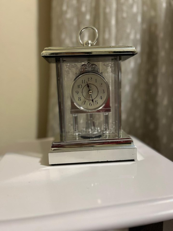 Evinizin her köşesine zarafet katacak, lüks görünümlü bu masa saatini kaçırmayın! Kristal/Şeffaf kasası ve parlak krom/metal detaylarıyla modern ve klasik dekorasyonlara kolayca uyum sağlar. Saatin alt kısmında bulunan, döner mekanizmalı sarkaç (torsiyon sarkaç), çalışırken büyüleyici bir görsel şölen sunar. Sessiz çalışır, pil ile kullanıma uygundur (kuvars mekanizma). İster salonunuzda, ister ofisinizde göz kamaştırıcı bir aksesuar olarak kullanın. #MasaSaati #LüksDekor #ŞeffafSaat #DönenSarkaç #Aksesuar #Hediyelik
