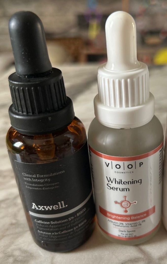 Axwell serum, Voop beyazlatıcı serum ve New Well beyazlatıcı roll-on deodorant içeren cilt bakım seti. ✨ Beyazlatıcı serum yarısına kadar kullanıldı, roll on ve kafein göz altı morluğu karşıtı serum sıfırdır