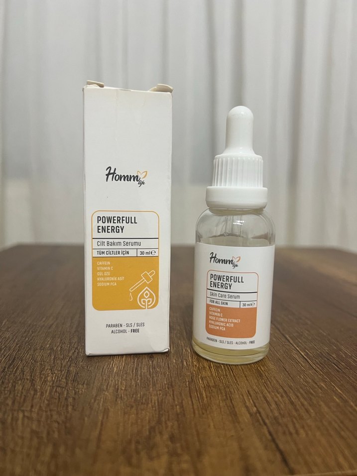 Kafein ve vitamin C içerikli serum. Hommbitkisel hommlife powerfull energy serum 30 ml. Yüzde 70 doludur. Cildi aydınlatır ve canlandırır. Özellikle Göz altı kararmalarına iyi gelir. Elimde fazla ürün var bu yüzden satıyorum. #aydınlatıcı #gözaltıserum #aydınlatıcıserum #enerjiserum #hommlife #hommbitkisel #energyserum