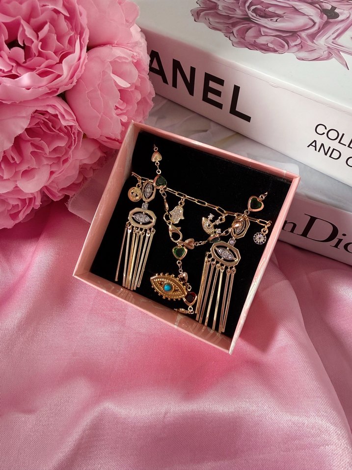 İçersinde ; 1 adet manifest çelik bileklik 1 adet göz detaylı çelik yüzük 1 adet çelik kalpli renkli y kolye 1 çift xuping göz detaylı kolye