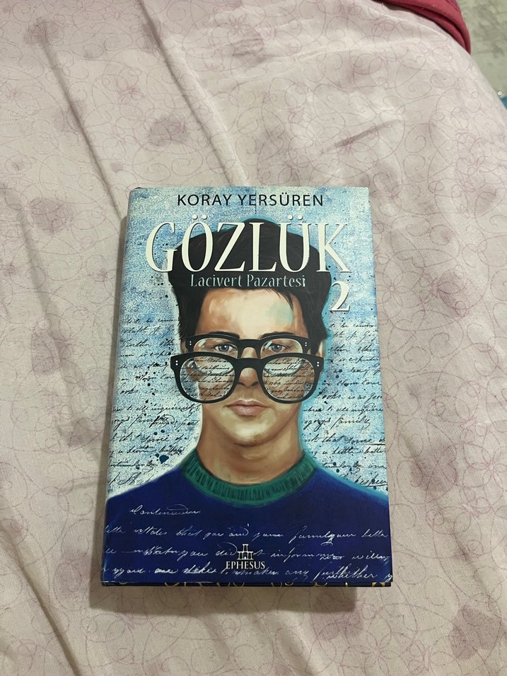 Koray Yersüren'in "Gözlük 2" adlı romanı, lacivert arka plan ve el yazısı metinlerle kaplı, gözlüklü bir karakteri konu alıyor. Uzun. Zamandır rafta olduğu için sararmalar var ekledim onuda.
