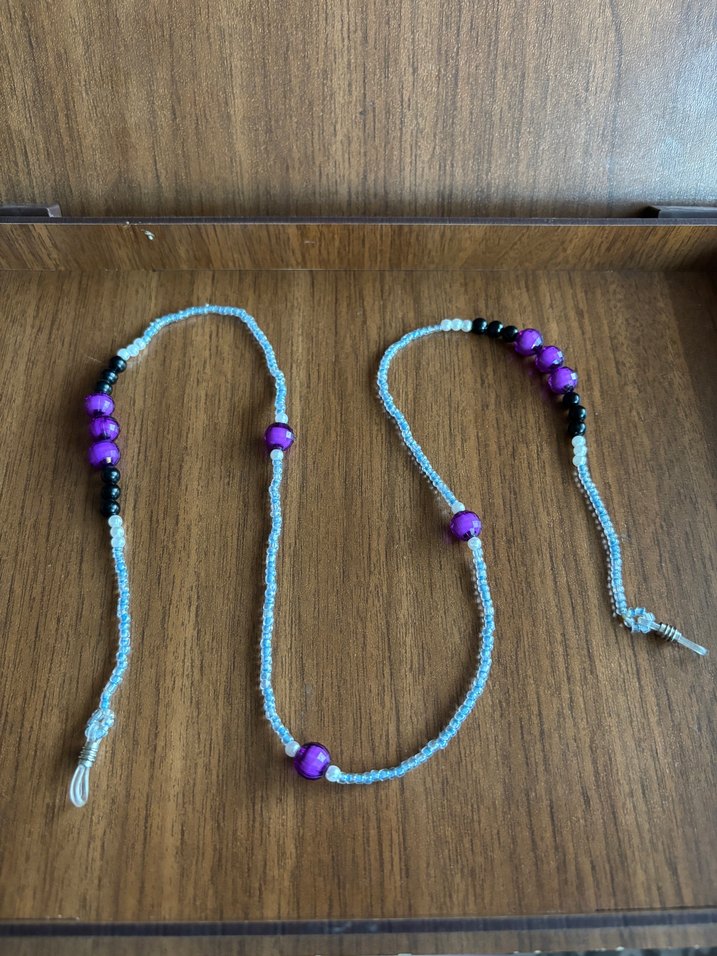 Bir kez kullanıldı mor ve şeffaf boncuklu. Elastik her gözlüğe uyar.
