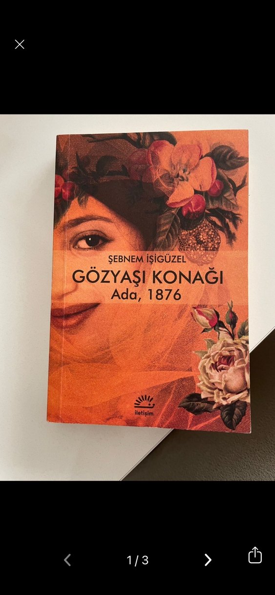 Şebnem Işıgüzel'in Gözyaşı Konağı Ada, 1876 adlı romanı. Kapakta çiçek desenleriyle yüz yakın çekim yer alıyor.