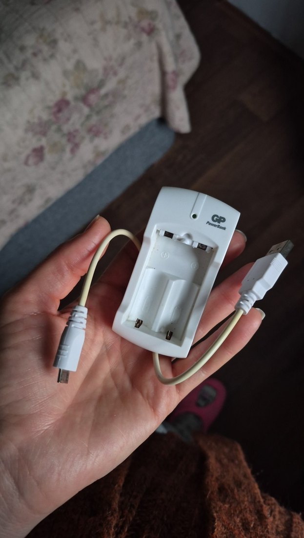 Beyaz GP PowerBank şarj cihazı, AA veya AAA piller için USB kablo ile bağlantı sağlar.
