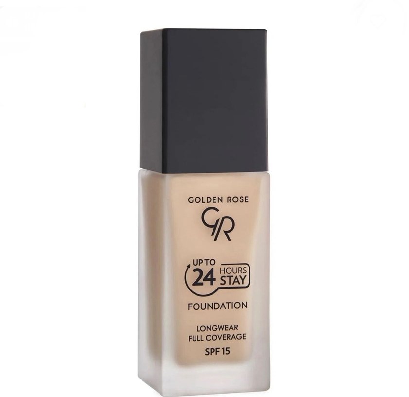 Golden Rose fondöten, açık bej tonunda tam kapatıcılık sağlar. 24 saate kadar kalıcılık ve SPF15 içerir.