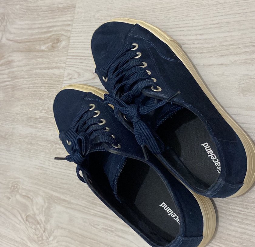 Lacivert bez malzemeden üretilmiş kadın spor ayakkabısı, günlük kullanım için çok uygundur. Bir kaç kere giydim fazlalık olduğu için satıyorum.