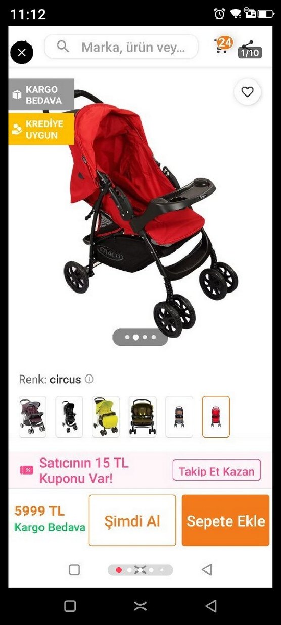Koyu kırmızı renkte bebek arabası, sağlam iskelet ve kullanışlı tepsiye sahiptir. İndirim kuponu ve kredi ile satın alma imkanı mevcuttur.