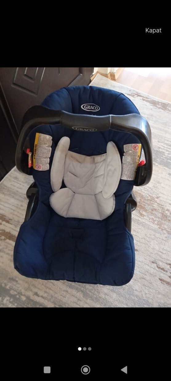 Graco marka koyu mavi renkli bebek oto koltuğu, yumuşak dolgulu ve taşıma için güvenli saplıdır. Bebekler için konfor ve güvenlik sağlar.